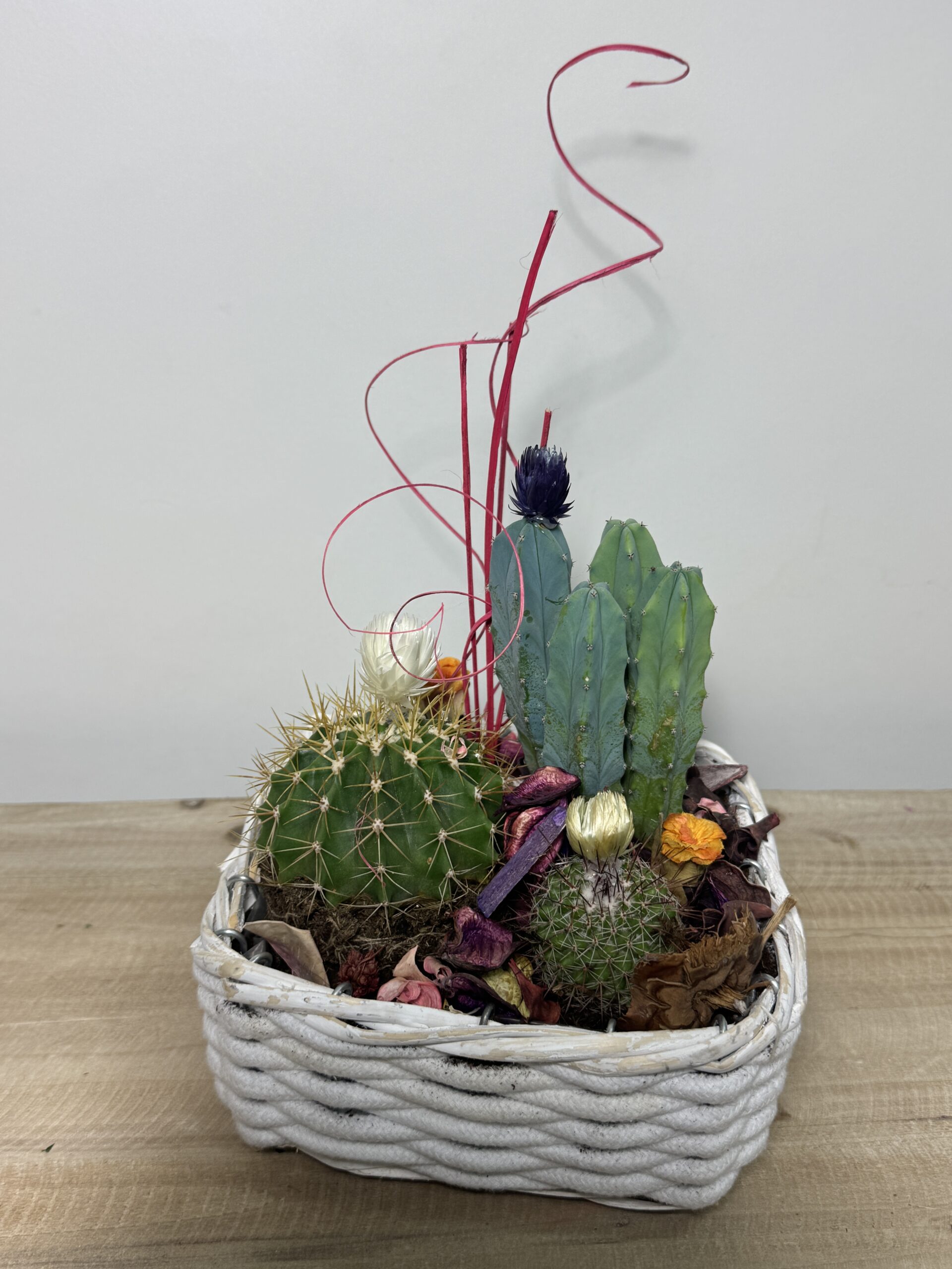Nuestra composición de cactus, que combina diferentes variedades de cactus en un arreglo cautivador. Estas plantas suculentas son conocidas por su resistencia y su aspecto único, con formas y espinas diversas que las hacen destacar. La composición de cactus puede incluir cactus de diferentes tamaños y formas, desde pequeños cactus redondos hasta cactus columnares o con ramificaciones. Este arreglo de cactus es perfecto para agregar un toque desértico y moderno a cualquier espacio interior, como salas, escritorios o incluso jardines en miniatura. Los cactus son fáciles de cuidar y requieren poca atención, lo que los convierte en una opción ideal para aquellos que buscan plantas de bajo mantenimiento. Disfruta de la belleza y la singularidad de nuestra cautivadora composición de cactus.