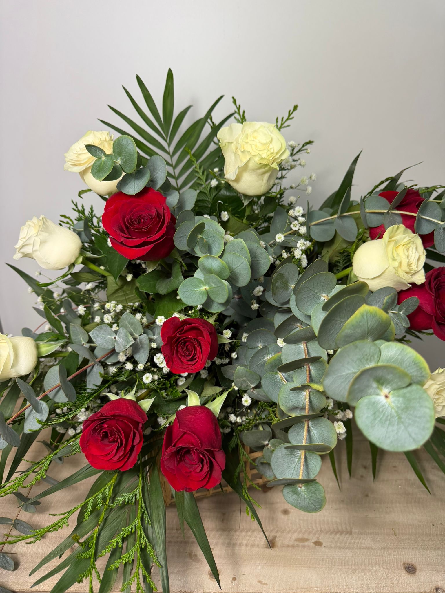 La combinación más noble de la naturaleza llega con nuestro ramo Pureza. Diez rosas premium en tonos rojo pasión y blanco marfil se entrelazan sobre un manto de delicada paniculata, creando un contraste visual cargado de significado. Enmarcado por el frescor aromático del eucalipto y verdes silvestres, este arreglo es la máxima expresión de respeto, amor puro y distinción. Un diseño clásico que nunca pasa de moda, ideal para momentos donde solo la sencillez de una rosa perfecta puede hablar por ti.