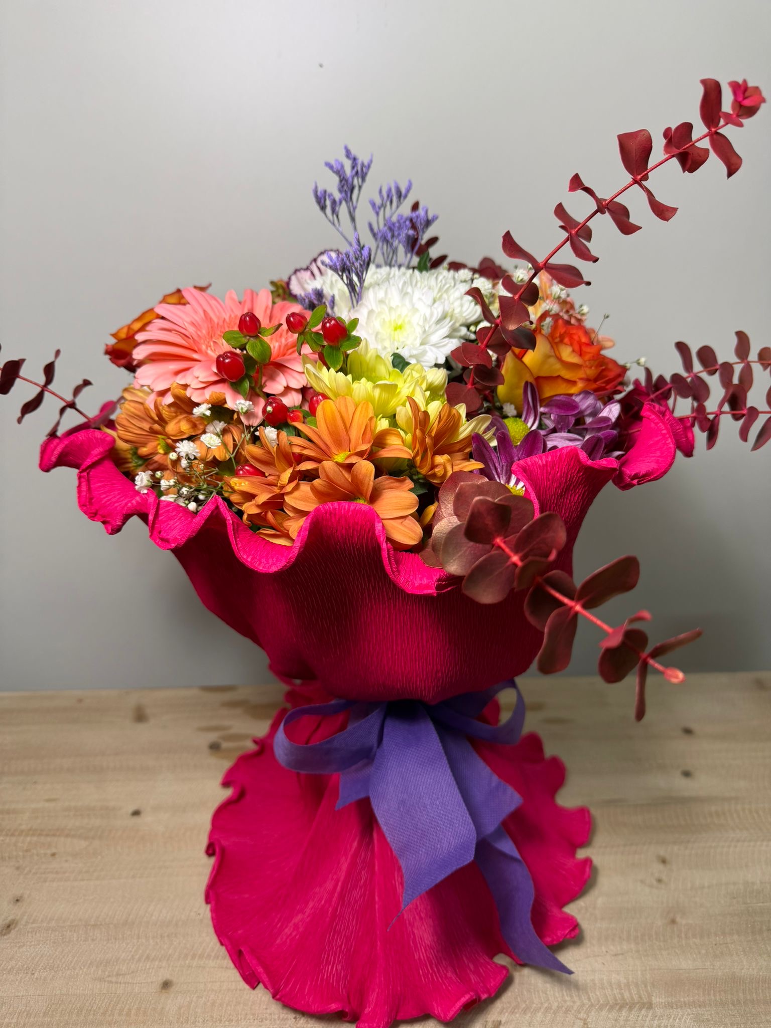 Fiel a su nombre, el ramo Vida es una explosión de optimismo y color. Con una base de flores alegres como gerberas y crisantemos, este diseño destaca por sus detalles de bayas rojas y su original presentación en papel fucsia ondulado. Es el regalo perfecto para enviar energía positiva, celebrar un nuevo comienzo o simplemente romper con la monotonía. Un arreglo dinámico, divertido y con un diseño que no necesita jarrón para brillar desde el primer minuto.»